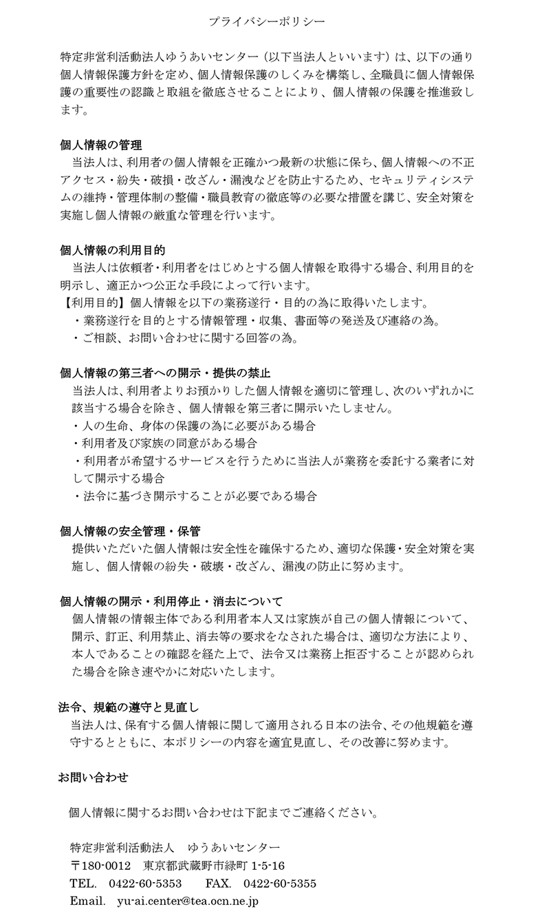 ゆうあいセンターは、利用者が快適で充実した毎日が過ごせることを最も大切にしています。